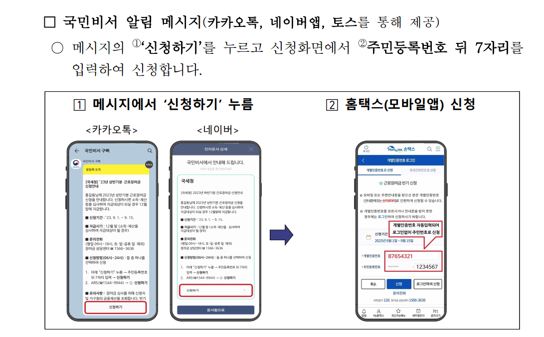 2. 신청금액과 실제 지급되는 금액은 다를 수 있습니다. 안내문의 신청금액은 국세청이 보유하고 있는 자료를 반영하여 계산한 것으로 신청인의 실제 가구, 소득, 재산 현황에 따라 실제 지급액은 신청금액과 차이가 나거나 지급되지 않을 수 있습니다.