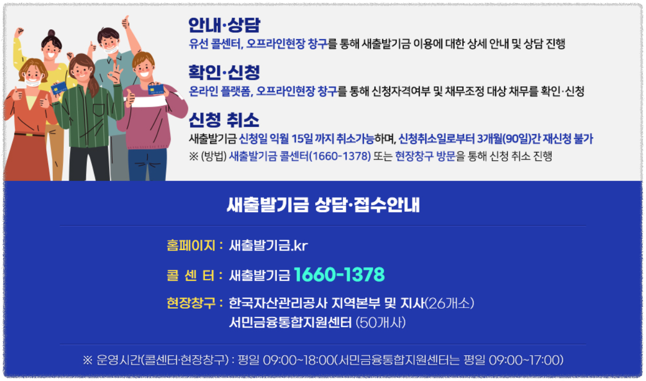 새출발기금은 온라인(새출발기금.kr), 한국자산관리공사 26개 사무소, 서민금융통합지원센터 50개 등 총 76개 현장 창구에서 신청할 수 있습니다. (주말 및 공휴일에는 홈페이지가 운영되지 않습니다.)