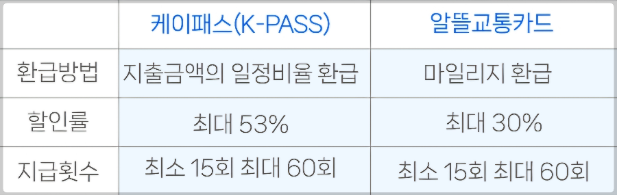 마일리지로 환급받던 알뜰교통카드의 경우 마일리지 지급구조가 어렵기에 이용자들의 이용이 불편하다는 지적이 많아 이러한 단점을 보완하고자 케이패스 (K-PASS)를 출시하였습니다.